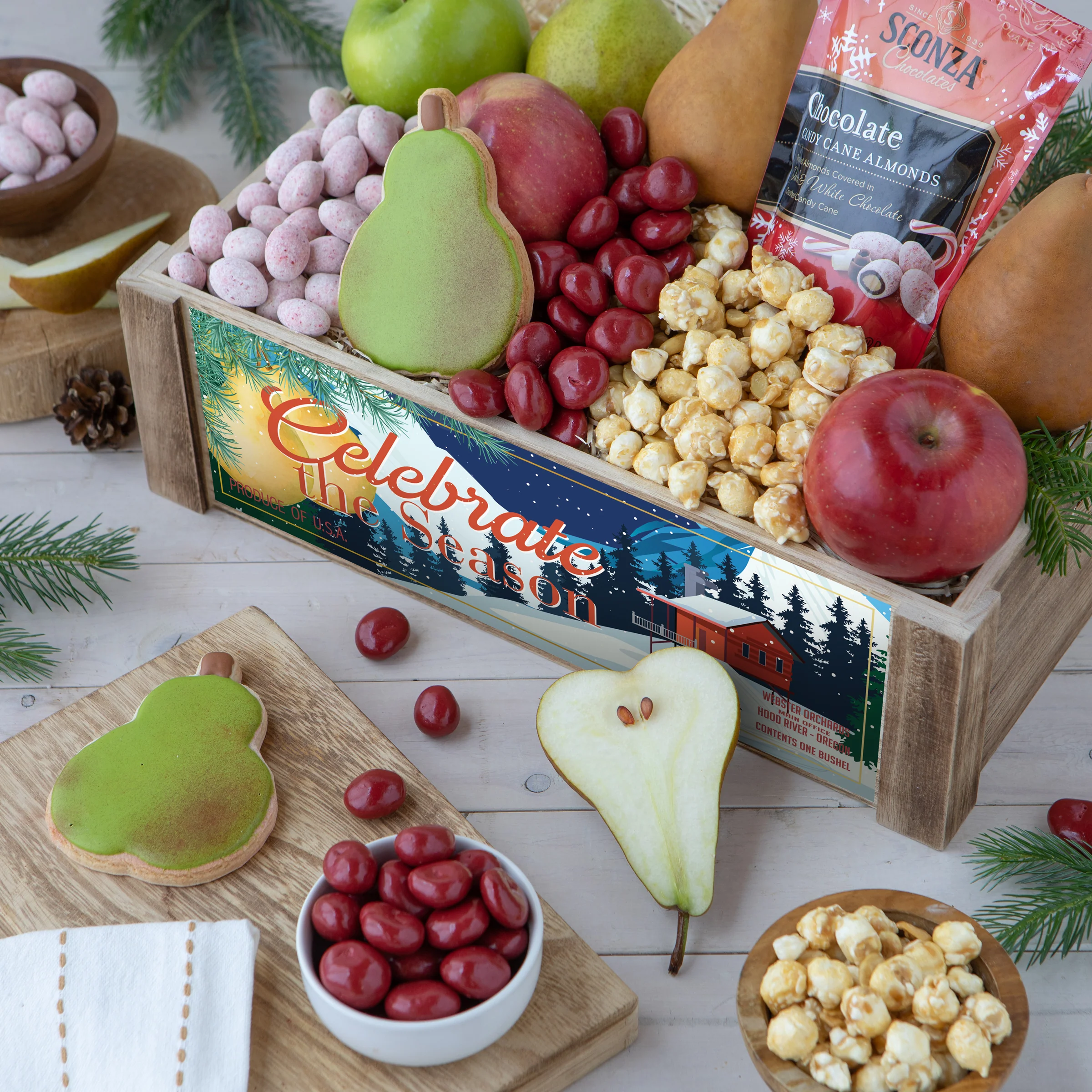 Tis the season to be jolly, let our Deck the Halls Gift Crate be the perfect addition to your holiday celebrations. Juicy pears and crisp apples feel right at home in this vintage style fruit crate. Top it off with our signature chocolate covered cherries, candy cane almonds, caramel cashew crunch popcorn, and the perfect shortbread pear cookie, and you will have friends and family come far and wide to help get the party started.